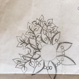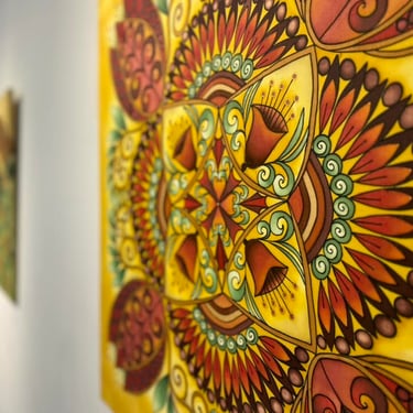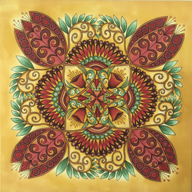 Paveikslas primena senovinį vitražą, kurio spalvos, lyg šviesa, kuri skverbiasi pro aukštus pilies ar bažnyčios langus. Ornamentuose susipinantys tulpių žiedai, lapeliai ir augaliniai raštai, tarsi pasakoja apie gyvybę, klestėjimą ir laiko tėkmę. Simetriška kompozicija kuria tvarkos ir harmonijos pojūtį, primindama senųjų meistrų kruopštumą. Paveikslo centre išryškėja kryžiaus motyvas, kuris tampa dvasinės stiprybės, tikėjimo ir vertybių ašimi. Šis ženklas subtiliai įsilieja į augalų ornamentiką, parodydamas, kad tikėjimas ir gamta gali darniai sugyventi. „Pilies istorijos“ – tai spalvotas pasakojimas apie praeitį, saugomą sienų, langų ir žmonių atminties.