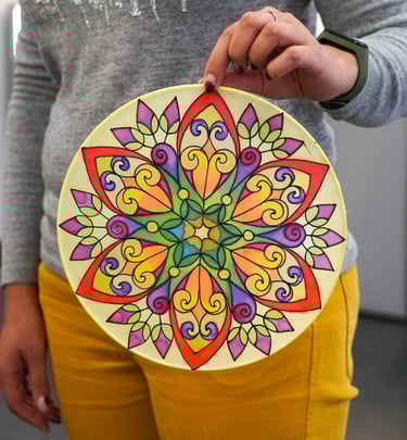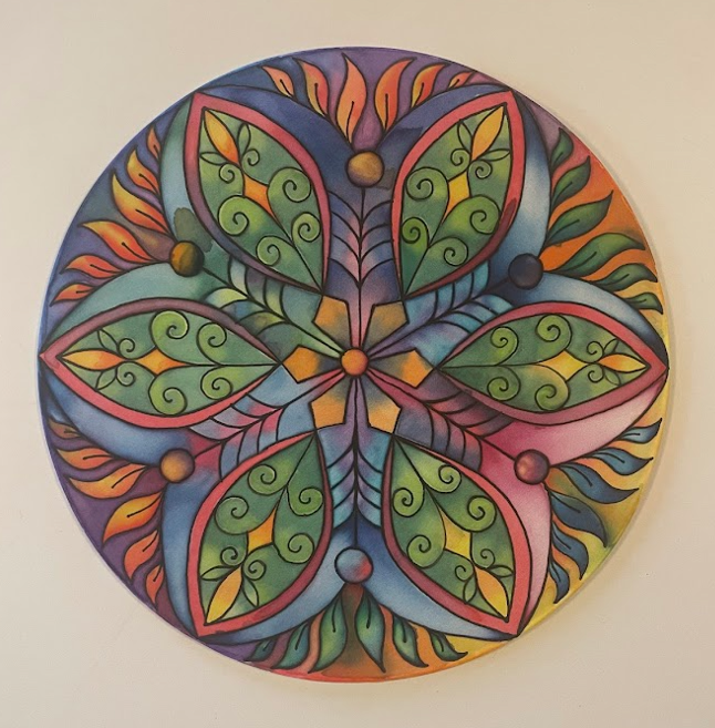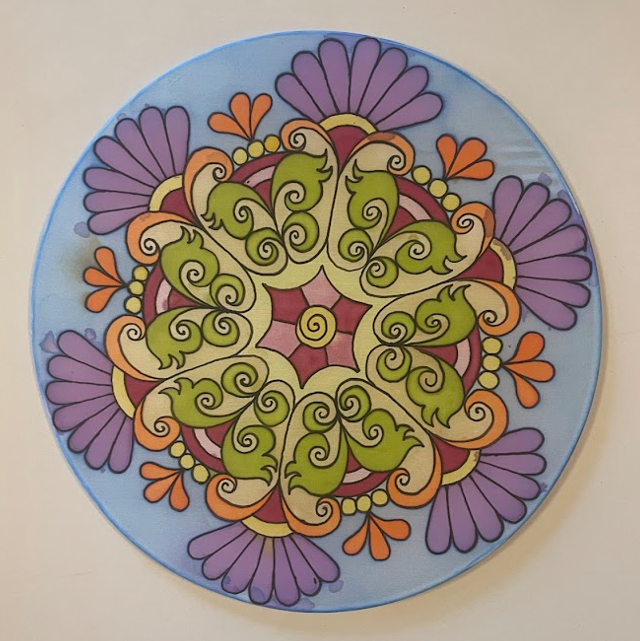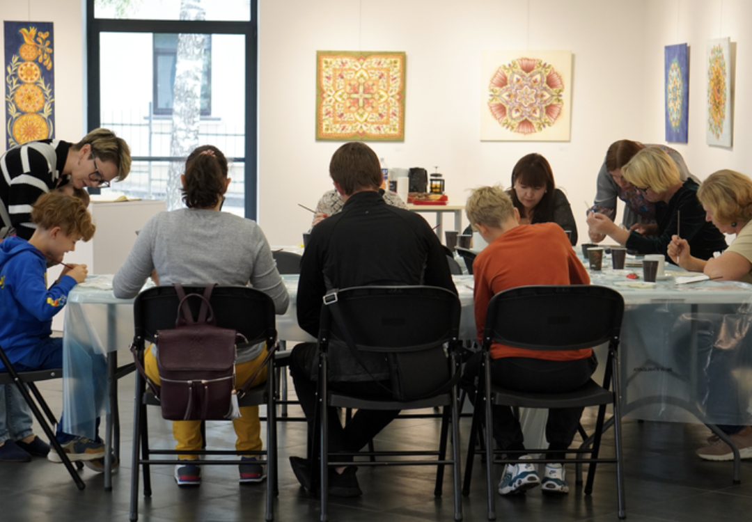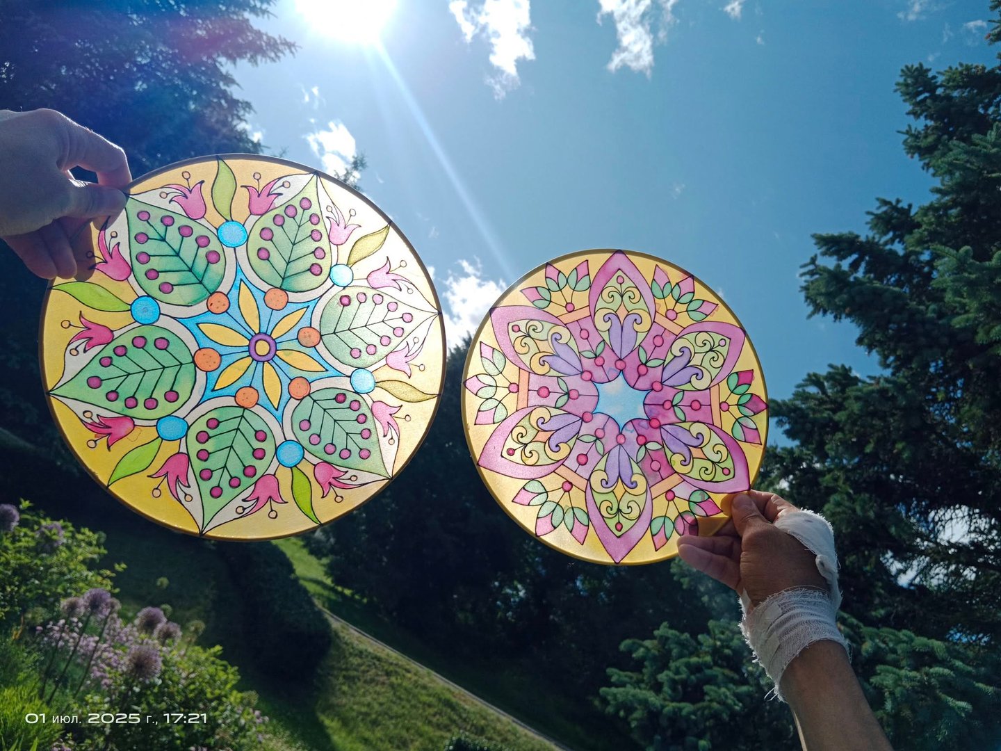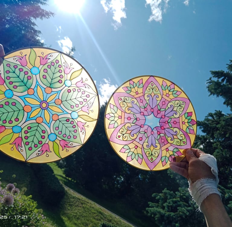 Šilko mandalos, kurias sukūrė dalyviai per dirbtuves. Kiekvienas dalyvis išsineša savo sukurtą šilko darbą, kurį galima lengvai pritaikyti interjere.