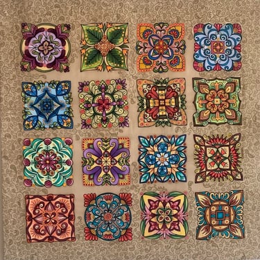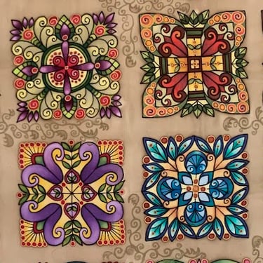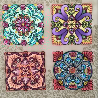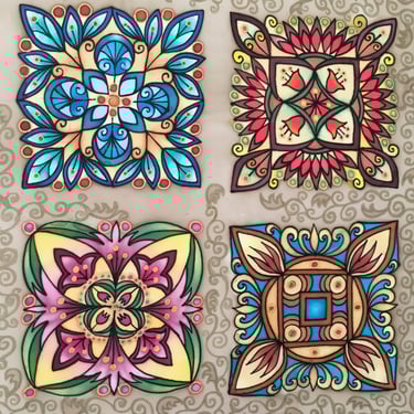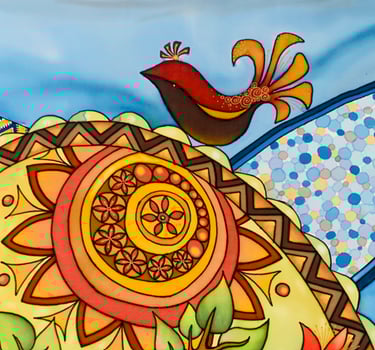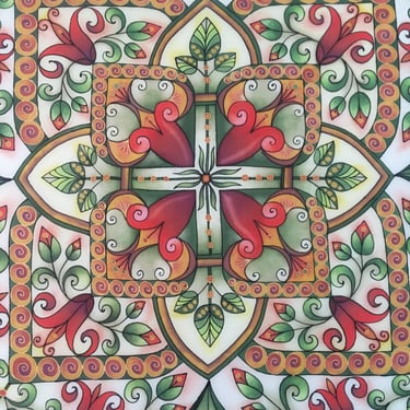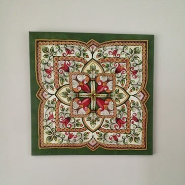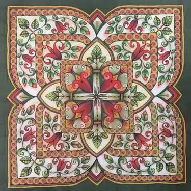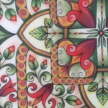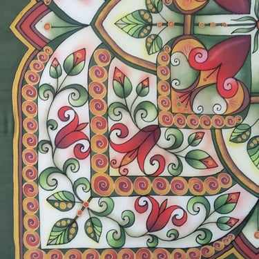 Paveikslas primena senovinį vitražą, kurio spalvos skverbiasi lyg šviesa pro aukštus pilies ar bažnyčios langus. Ornamentuose susipina tulpių žiedai, lapeliai ir augaliniai raštai, tarsi pasakojantys apie gyvybę, klestėjimą ir laiko tėkmę. Simetriška kompozicija kuria tvarkos ir harmonijos pojūtį, primindama senųjų meistrų kruopštumą. Paveikslo centre išryškėja kryžiaus motyvas, kuris tampa dvasinės stiprybės, tikėjimo ir vertybių ašimi. Šis ženklas subtiliai įsilieja į augalų ornamentiką, parodydamas, kad tikėjimas ir gamta gali darniai sugyventi. „Pilies istorijos“ – tai spalvotas pasakojimas apie praeitį, saugomą sienų, langų ir žmonių atminties.